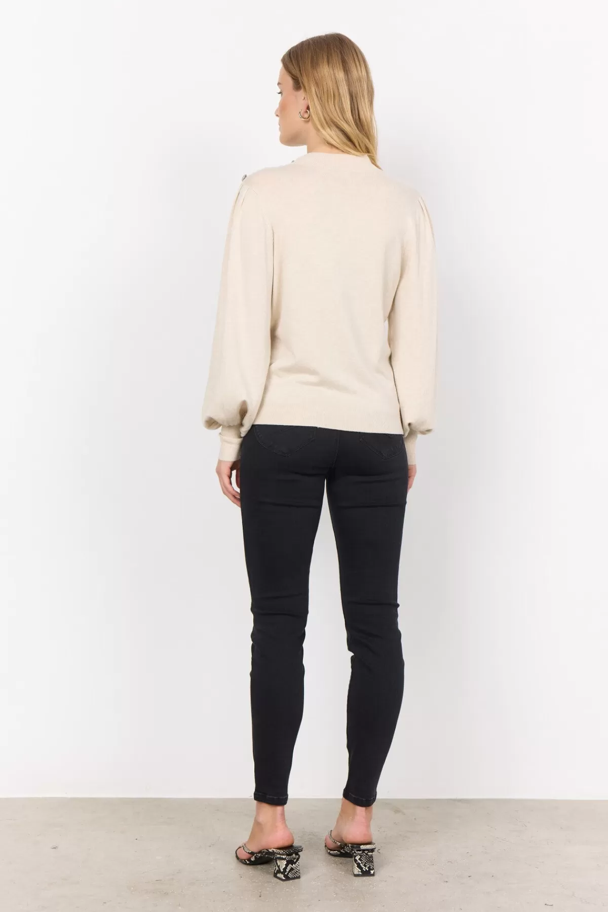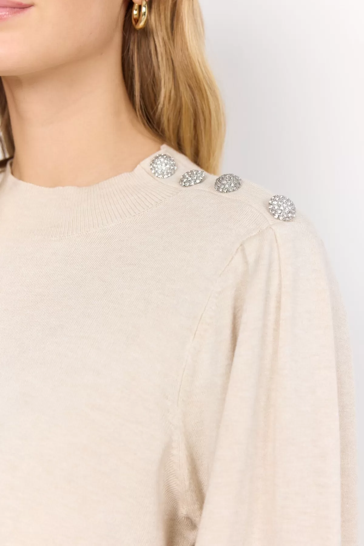 SC-Dollie 745 is a classic pullover made from a nice blend of viscose and nylon. The pullover has a high neckline, long balloon sleeves, a comfortable fit and a nice button detail at the shoulder. Style this lovely pullover with your favourite trousers and some loafers for an elegant look.