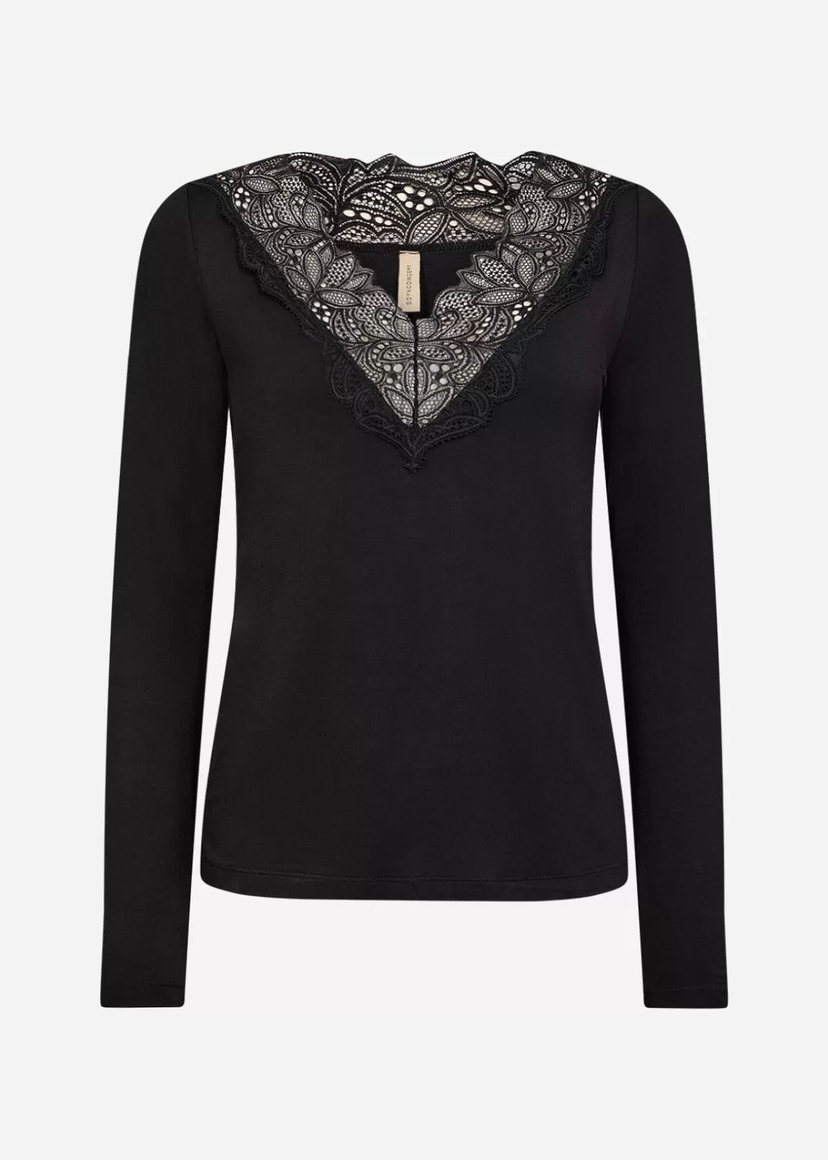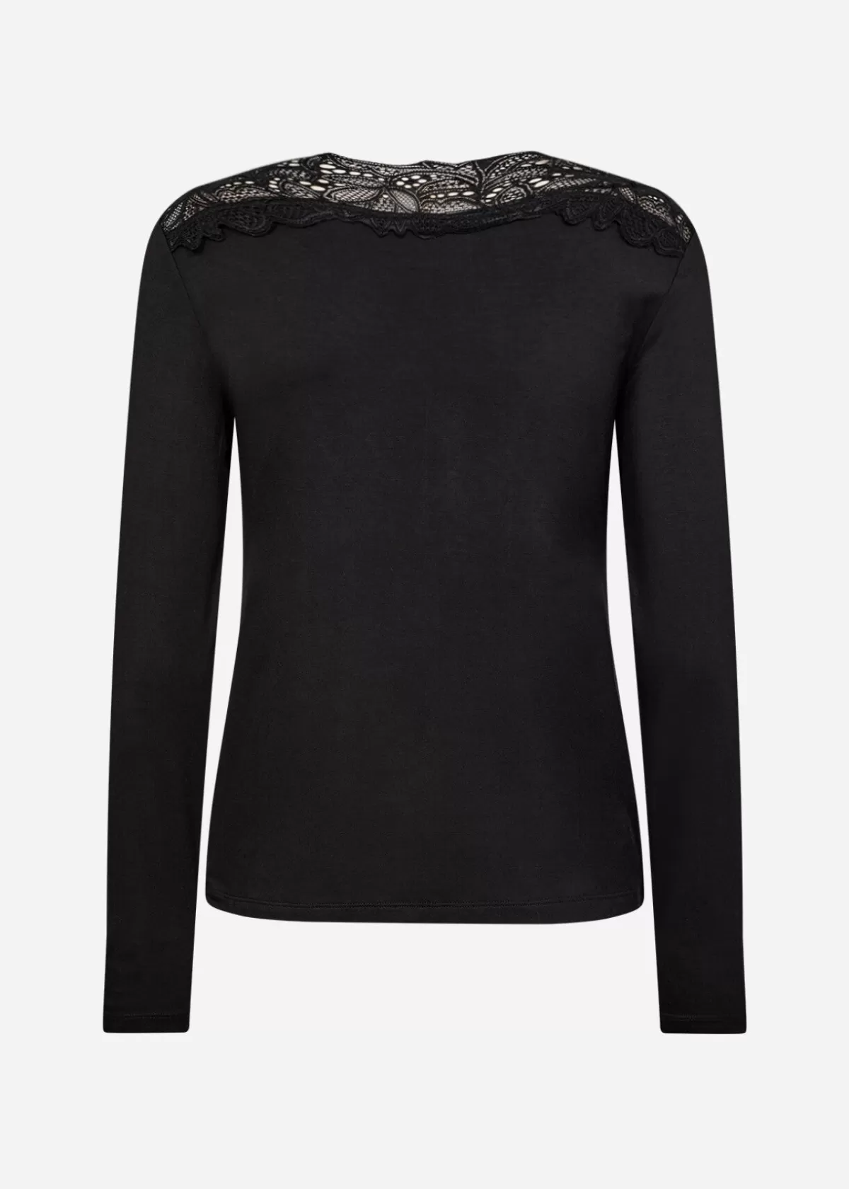 SC-Marica 301 is a basic t-shirt made from a nice blend of lyocell and elastane. The t-shirt has a flattering v-neck with lace, long sleeves and a normal fit. Style it with a denim skirt and some boots for a nice everyday look.